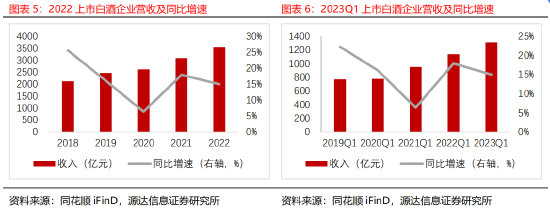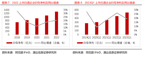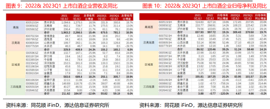 2022 年,上市白酒企业总营收达到 3552.5 亿元,同比增加 15.0%,归母净利润 1304.7 亿元,同比增长 20.3%。2023Q1,上市白酒企业总营收达到 1311.4 亿元,同比增加 15.4%,归母净利润 535.2 亿元,同比增加 19.1%。受疫情影响,白酒消费场景受限,营 业收入及净利增速均有所下滑,但上市白酒企业整体向好的趋势并未改变,业绩持续实现增长。