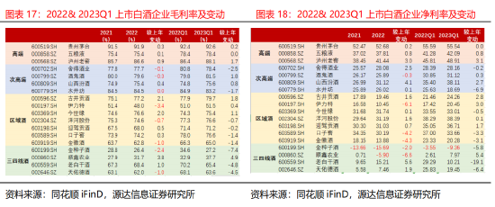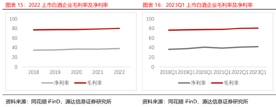 2022,上市白酒企业毛利率 80.2% ,同比增加 1.34 个百分点 ,净利率 37.1%,同比增加 1.62 个百分点。2023Q1,上市白酒企业毛利率 80.8% ,同比增加 0.52 个百分点 ,净利率 41.0%,同比增加 1.16 个百分点。受益于产品结构优化,渠道改善,盈利能力提升。