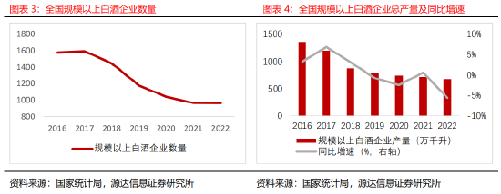 2022 年全国规模以上白酒企业共 963 家,企业数量持续下降,相比 2021 年下降两家; 实现产量 671.2 万千升,同比减少 5.58%,自 2016 年规上白酒企业产量达到顶峰后,连续 6 年下跌,目前产量仅达到 2016 年的 50%;实现销售收入 6626.5 亿元,同比增长9.6%;实现利润总额 2201.7 亿元,同比增长 29.3%。销售收入及利润总额持续增长,行业整体向好,企业数量不断下降,市场向龙头企业集中。