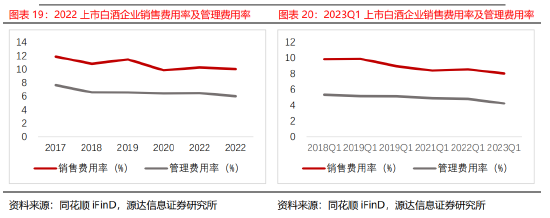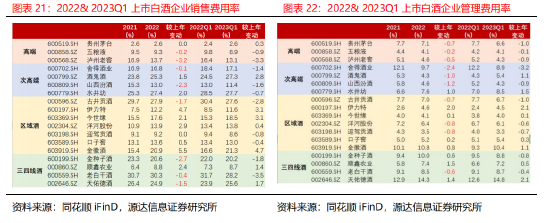 2022,上市白酒企业销售费用率 10.0% ,同比下降 0.5 个百分点 ,管理费用率 6.0%,同 比增加 0.55 个百分点。2023Q1,上市白酒企业销售费用率 8.0% ,同比下降 0.6 个百分点 ,管理费用率 4.2%,同比减少 0.58 个百分点。