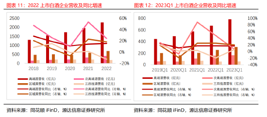 整体来看,高端酒增速始终保持稳定,刚需属性使得其动销几乎不受消费场景变化的影响。 次高端酒虽然 2022 全年增速优秀,但受商务恢复不及预期,库存增加,渠道压制影响, 2023Q1 增速表现不佳。区域酒 2023Q1 业绩增速明显,主要是由于春节返乡,回补型的 婚宴、餐饮的驱动。