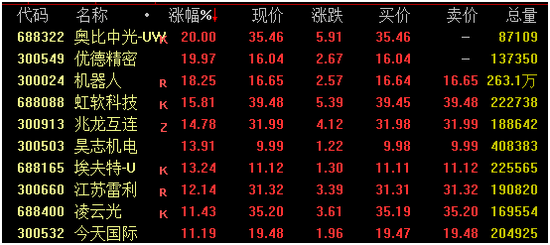 智能机器概念强势拉升,截至收盘,奥比中光、优德精密“20cm”涨停,机器人涨超18%,虹软科技、兆龙互连涨约15%,埃夫特、江苏雷利、凌云光等涨超10%。
