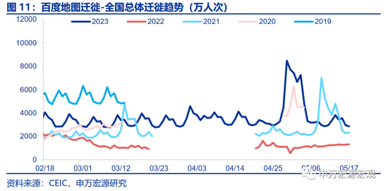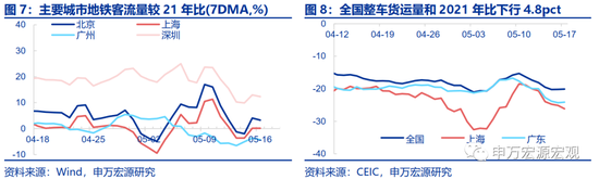 2)服务消费:全国整车货运量有所回落,京沪深迁徙指数继续上行。截止5月17日,全国整车货运量较2021年同期下行4.8pct至-20.1%;京沪深迁徙趋势较2021年同期上行5.7pct至16.7%。