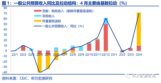 4月一般公共预算收入同比走高64.5个百分点至70.0%,增幅远超近期经济改善幅度,主因22年4月存量增值税留抵退税7636亿所形成的超低基数,仅这一项就拉动4月增速62.3个百分点。一般公共预算收入并没有回补,而只是回到了正常的增长路径上,剔除基数(下同)扰动后,4月一般公共预算收入同比下行0.6个百分点至4.8%,结构呈现税收收入(+1.1pct至6.7%)改善,非税收入(-14.7pct至-9.7%)退坡格局。