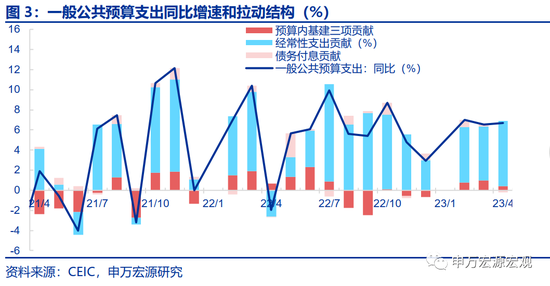 4月一般公共预算支出同比小幅提升0.1个百分点至6.7%,并没有跟随收入大幅改善放量,目的在于对全年需求的平滑作用。支出结构中,财政经常性支出(+1.5pct至8.6%)增速抬升,尤以教育(+9.1pct至18.1%)和社会保障(+4.0pct至13.3%)高位基础上再度改善,体现出当前经济下行压力中,财政试图通过政府消费稳定社会总需求。预算内基建三项的增速(-2.6pct至2.2%)有所下滑,或是基建投资增速放缓的原因之一,《预算草案》中对于基建投资的谨慎态度正在体现。
