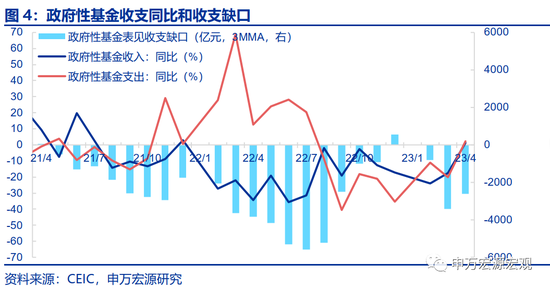 前期地产销售回暖滞后反映为卖地收入改善,但可持续性藏隐忧。4月政府性基金收入大幅改善19.0个百分点至1.4%,时隔15个月再次回正,主因前期地产销售积极回暖,滞后表现为国有土地使用权出让金收入的改善,单月同比上行达22.5个百分点至-0.7%。但4月以来地产销售再度走弱,充分体现出前期地产销售的高峰和递延需求释放有关,并非居民购房偏好的回归,可持续性存疑,卖地收入再度探底的可能性再加大。4月政府性基金支出也随收入改善而冲高,后续同样面临回落风险。