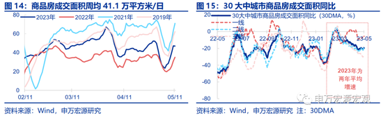 4)房地产市场:地产销售有所回落,因城施策继续加码。截至5月17日,30大中城市商品房周均成交面积两年平均增速回落7.5pct至-21.2%,分结构看,一线城市回升0.2pct至2.8%、二线、三线城市分别回落9.7pct、6.3pct至-21.8%、-35.0%。杭州再次放松限购。