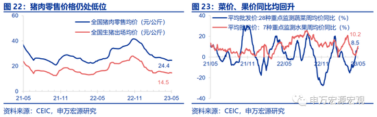 8)食品价格:猪肉价格继续下行,菜价、果价继续回升。截至5月10日,猪肉零售价下跌0.9%至24.4元/公斤;截至5月17日,蔬菜、水果价格分别环跌0.9%、环涨2.9%,同比分别回升2.4pct、5.6pct至8.5%,10.2%。