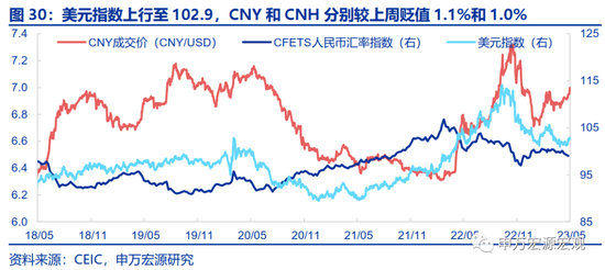 美元指数上行,人民币被动贬值。截至5月17日,美元指数上行至102.9,CNY和CNH分别报收6.9985和7.0021,分别较上周贬值1.1%、1.0%。