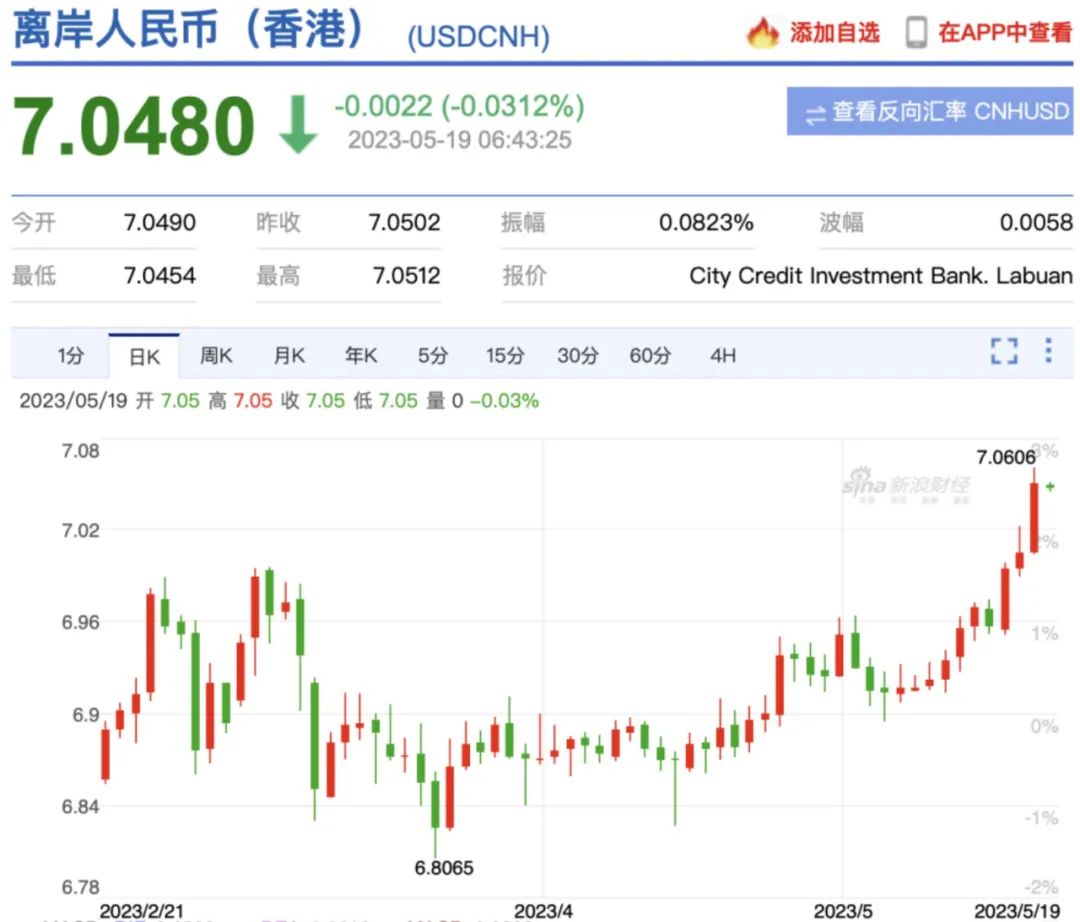 其实,从5月5日至今,人民币便出现了一波明显跌势,使得人民币汇率再次落入7区间。这是2022年12月以来人民币对美元即期汇率首次击穿7这一整数关口。