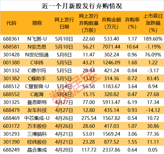 证券时报·数据宝统计,从近一个月发行新股看,网上发行弃购率居前的有N安杰思、曼恩斯特、C慧智微-U等,弃购率分别为10.64%、6.19%、3.64%,弃购金额居前的有N安杰思、曼恩斯特、晶合集成等,弃购金额分别为7071.44万元、5913.47万元、2337.86万元。