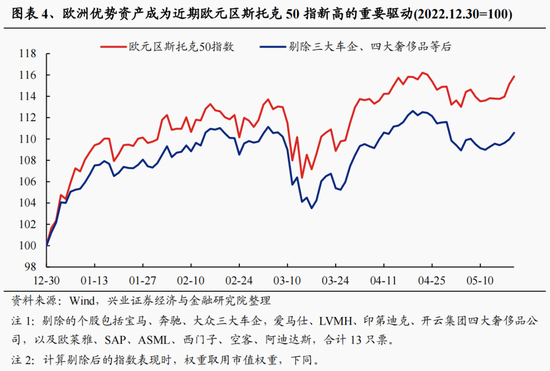 欧洲股市创下历史新高,主要受到其特色、优势资产的驱动。包括三大车企、爱马仕、LVMH、印第迪克等奢侈品在内的可选消费,以及SAP、ASML、西门子、空客等欧洲优势企业,成为本轮斯托克50指数上涨的重要驱动。当我们剔除这些欧洲优势企业,可以看到在经历年初的共振式修复后,欧洲市场整体以震荡为主,收益并不显著。