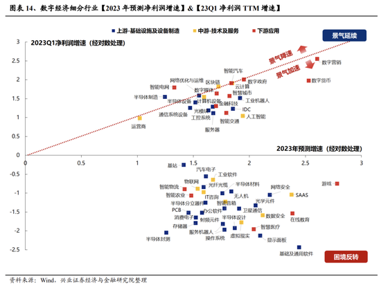 据一季报,数字经济产业链中,中游软件/服务以及下游应用逐渐开始兑现业绩。其中,上游(卫星通信、半导体设备、半导体制造、IDC、计算机设备等)、中游(云计算、区块链、AIGC、人工智能、行业应用软件等)和下游(数字营销、数字政府、数字货币、智能电网、数字媒体)等行业兼具高景气和高弹性。展望2023年全年,数字营销、智能汽车、数字政府、云计算、计算机设备、半导体设备和半导体制造等行业有望延续2023Q1的高增速,而游戏、基础通用软件、SAAS、在线教育、网络安全、数据安全、智慧医疗和显示面板等行业的景气度有望实现困境反转。(详见2023年5月4日发布的报告《数字经济60大细分方向Q1景气一览》)