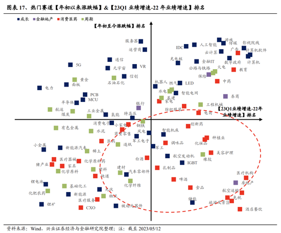 从23Q1业绩改善和年初至今(截至5月12日)的涨跌幅来看,出行链、医药、食品饮料和高端制造等部分板块或存在修复空间。出行链(酒店餐饮、航空运输、旅游及景区)、医药(医疗机构、创新药、美容护理)、食品饮料(食品、啤酒、乳制品)和高端制造(储能、航空发动机、IGBT)等细分方向【年初以来涨跌幅】排名远低于【23Q1业绩增速-22年业绩增速】,显示这些行业尚未充分反映2023年一季度的业绩改善,后续或存在修复机会。