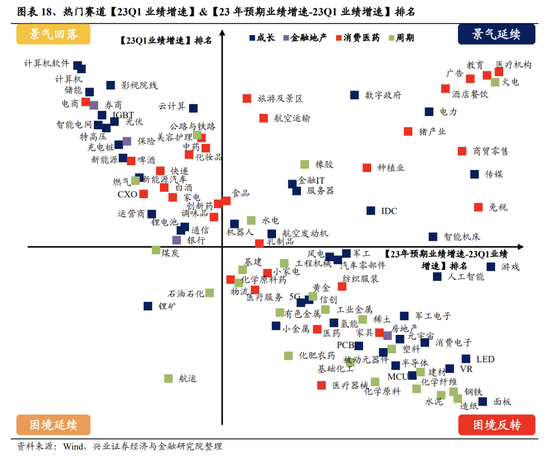 从2023年全年业绩预期增速和2023Q1实际业绩增速来看,TMT、出行链、材料、医疗机构以及火电等板块后续业绩弹性较强。参考【23Q1业绩增速】以及【23年预期业绩增速-23Q1实际业绩增速】排名数据,TMT(游戏、教育、面板、广告、LED、VR、人工智能等)、出行链(商贸零售、酒店餐饮)、材料(钢铁、水泥)以及医疗机构、火电等板块2023年一致预期净利润增速较2023Q1仍有较大改善空间,后续有望迎来业绩兑现机会。