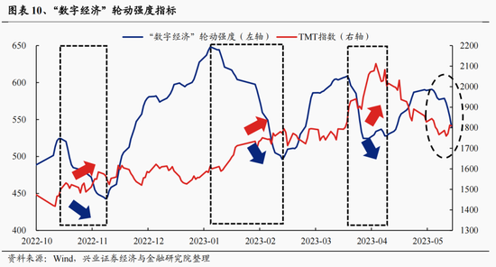 当前“数字经济”轮动强度已从高位开始回落。参考过去几次“数字经济”轮动强度冲高回落的板块表现,往往意味着调整的结束以及形成新的主线方向。我们通过对“数字经济”60大细分方向计算近5日涨跌幅排名变动绝对值加总,构建“数字经济”轮动强度指标。我们发现,TMT指数与“数字经济”轮动强度多数时间呈反向走势:本轮“数字经济”行情从去年10月启动以来,每当板块开始波动调整时,基本都伴随着“数字经济”主线发散、轮动加快。而当“数字经济”内部轮动收敛、主线形成后,板块则往往会迎来整体上行。
