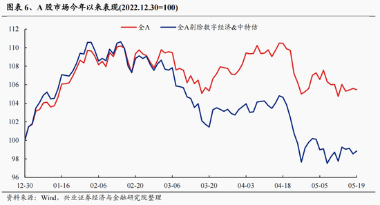 我们发现主要来自于AI相关个股的驱动:如微软、谷歌、英伟达、AMD、脸书等权重个股在AI浪潮推动下,年初以来均实现显著上涨。以标普500指数为参考,截至5月19日涨幅为7.6%。但当我们剔除其中的AI相关个股后,可以看到标普500指数剩余成分股今年以来市值加权收益水平几乎为零。