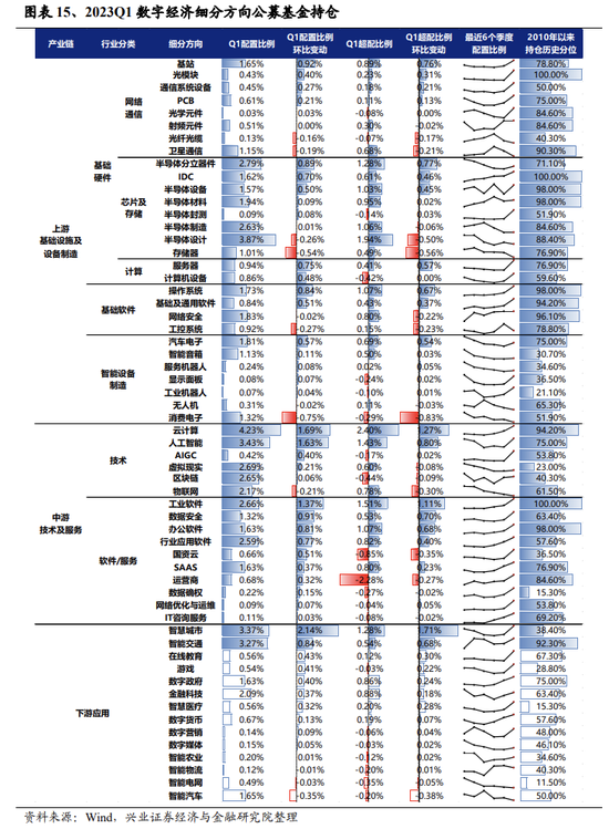从2023Q1公募基金持仓变动看,“数字经济”多数细分方向迎来机构资金增配。其中上游基站、光模块、半导体分立器件、半导体设备、IDC、服务器、操作系统、基础及通用软件;中游云计算、人工智能、工业软件、办公软件、数据安全;下游智慧城市、智能交通、在线教育、游戏、数字政府等获增配比例相对居前。