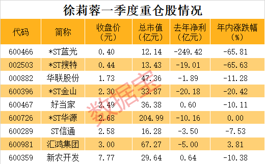 从持股情况来看,徐莉蓉一季度还出现在华联股份(维权)、*ST金山、好当家、*ST华源、ST信通(维权)、汇鸿集团、新农开发等个股前十大流通股东榜中,多为小市值重组题材股,其中徐莉蓉已出现在好当家、*ST金山、ST信通等个股去年年报前十大流通股东榜中。