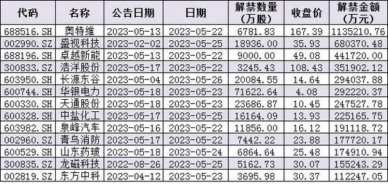 统计显示,下周(5月22日-26日)共有69家公司限售股陆续解禁,按最新收盘价计算,解禁市值为543.62亿元。从解禁市值来看,奥特维(113.52亿元)、盛视科技(68.04亿元)等公司解禁金额均超60亿元。
