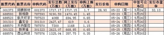 根据发行安排,下周有7只新股发行,其中科创板有4只。5月22日发行的是翔腾新材;5月23日发行的是新相微;5月24日发行的是航天环宇、鑫宏业;5月25日发行的是新莱福、天玛智控;5月26日发行的是西山科技。