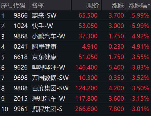 快手、蔚来涨超6%,小鹏汽车、阿里健康、哔哩哔哩等涨幅居前。