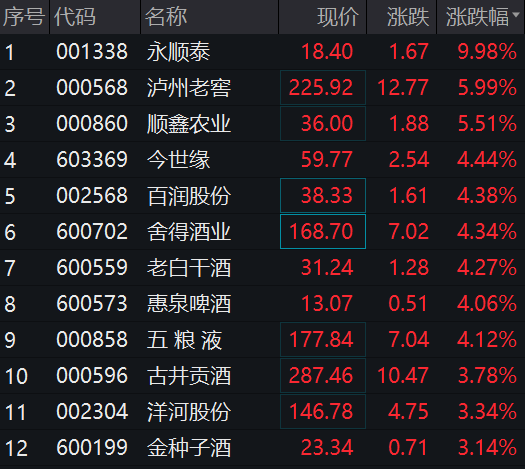 具体来看,上午酒类指数涨超3%。永顺泰大举涨停,泸州老窖、顺鑫农业涨超5%,今世缘、百润股份、舍得酒业(维权)、老白干、惠泉啤酒等涨超4%。