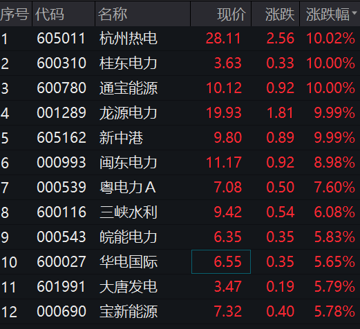 个股方面,杭州热电、桂东电力(维权)、新中港接连涨停。通宝能源、闽东电力、龙源电力、粤电力A等纷纷上扬,涨超6%。