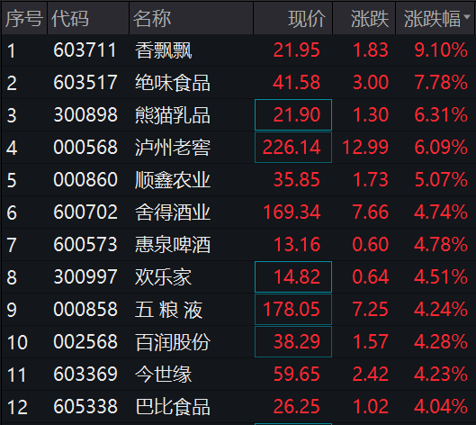 食品方面,香飘飘逼近涨停线,绝味食品、熊猫乳品大涨。