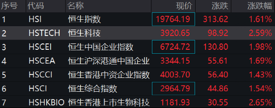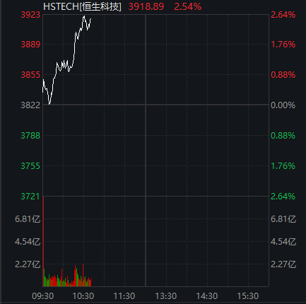 港股市场方面,早间三大指数全部高开:恒生指数涨0.15%,恒生国企涨0.24%,恒生科技涨0.39%。上午港股市场整体走高,恒生科技指数涨幅扩大至2.5%。