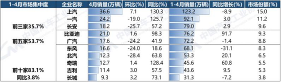 2023年1-4月,国内汽车销量排名前十位的企业集团销量合计为582.2万辆,同比下降3.6%,较1-3月收窄12.7个百分点,占汽车销售总量的84.8%,低于上年同期1.8个百分点。