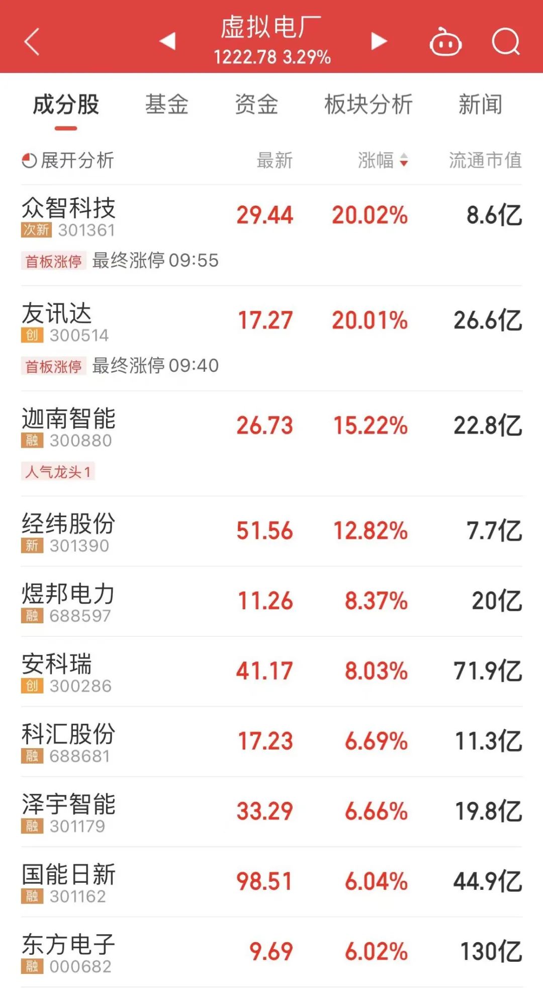 虚拟电厂早盘走势活跃,众智科技、友讯达20cm涨停,迦南智能涨超15%,经纬股份、安科瑞、国能日新、泽宇智能等股跟涨。
