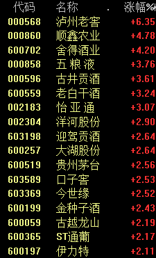 上午收盘,白酒板块中,泸州老窖涨超6%,贵州茅台涨超2%,五粮液涨超3%。
