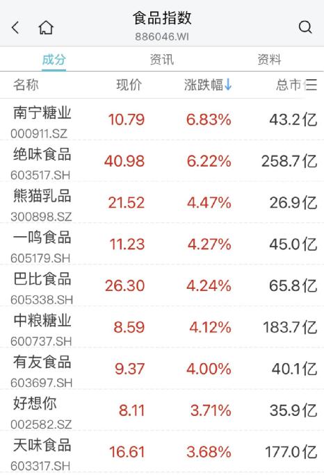 食品饮料等消费股走强,香飘飘一度触板,绝味食品、南宁糖业涨超6%,仲景食品、巴比食品、一鸣食品等跟涨。