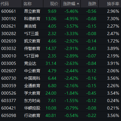 教育板块再度下探,昂立教育跌超5%,科德教育、美吉姆、传智教育等跟跌。