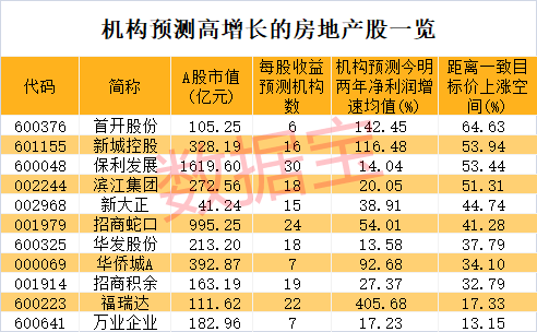 根据5家以上机构一致预测,11只地产股今明两年净利润增速均有望达到10%以上。以最新收盘价与机构一致预测目标价相比,首开股份、新城控股、保利发展、滨江集团等4股上涨空间逾50%。