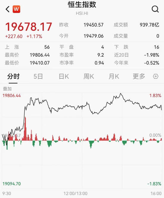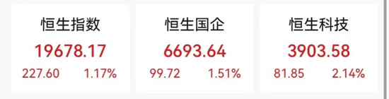 截至收盘,恒生指数收涨1.17%,涨227.6点,报19678.17点;恒生科技指数涨2.14%,报3903.58点;恒生国企指数涨1.51%,报6693.64点。