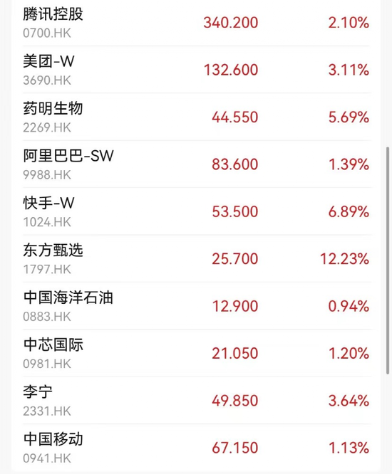 电力股拉升,龙源电力、华能国际电力涨超8%,华润电力涨超6%,中国电力涨近5%。教育股造好,东方甄选涨超12%,新东方涨逾4%。互联网医疗股上扬,阿里健康、叮当健康涨超4%,京东健康、平安好医生涨超2%。