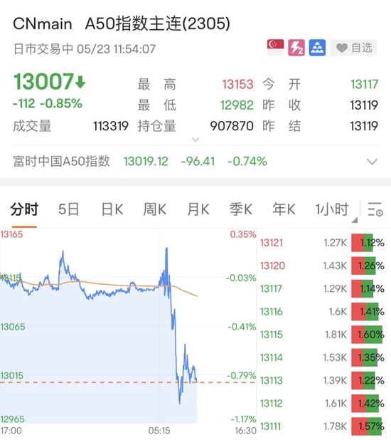 另外,富时中国A50指数期货盘中跳水,截至发稿跌0.85%。