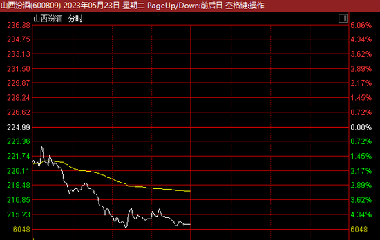 市值超2600亿的山西汾酒昨日盘初一度闪崩,创2年半多来新低后,今日开盘再度走低,最大跌逾5%,带动白酒股整体下跌,泸州老窖、老白干酒、五粮液等纷纷走弱。