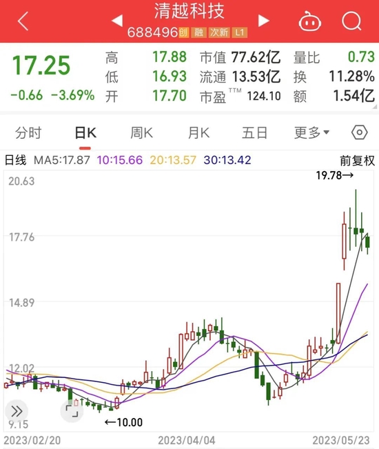 清越科技累计涨幅97.25%,排名第一。该公司于去年底上市,拥有中国大陆首条PMOLED(被动矩阵有机电激发光二极管)产品生产量产线,2022年PMOLED显示模组出货量占全球总量的32%,继续位居第一。今年一季度公司实现盈利420万元,同比扭亏为盈。5月19日,公司股价创上市以来新高。