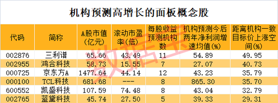 从未来增长潜力来看,按照5家以上机构一致预测,6只概念股今后两年净利润增速均有望超20%,分别是TCL科技、三利谱、凯盛科技、蓝黛科技、鸿合科技、京东方A。