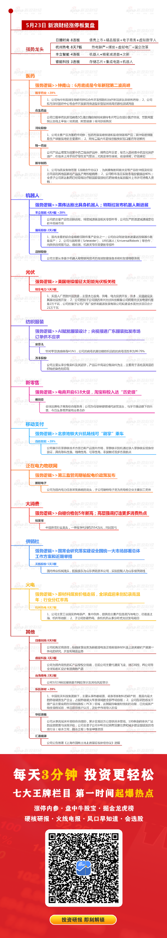 5月23日消息,大盘全天震荡走低,两市集体回调,三大指数均跌超1%。板块方面,医药医疗股全天逆市拉升,新冠特效药方向领涨,众生药业、新华制药等均触及涨停,互联网电商板块走强,若羽臣盘中涨停,供销社概念午后活跃;混合现实、ChatGPT等AI应用板块持续调整,电力板块陷入回调,算力、大数据板块集体走低,钢铁、军工、大金融等权重板块继续走弱。总体来看,个股呈普跌态势,两市超3700股飘绿,今日成交7658亿元。
