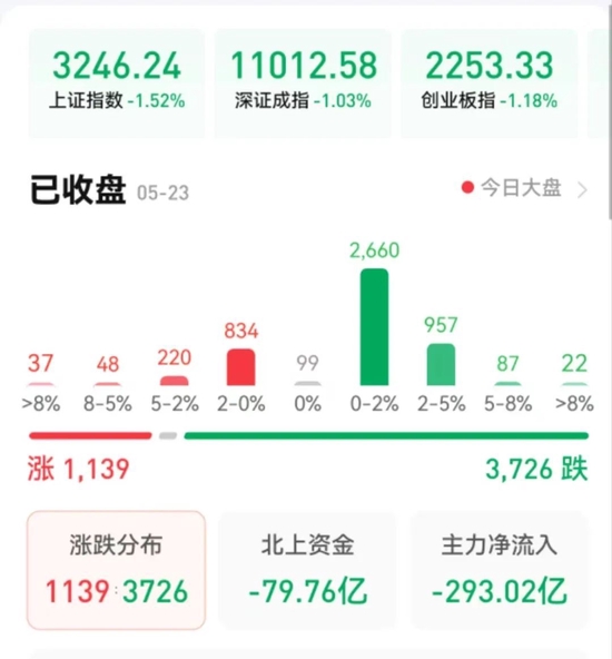 周二(5月23日),A股三大股指震荡回落,跌幅均超1%。截至收盘,上证指数跌1.52%,收报3246.24点;深证成指跌1.03%,收报11012.58点;创业板指跌1.18%,收报2253.33点。市场成交额持续低迷,合计金额仅7658亿元,北向资金净卖出79.76亿元,创近7个月最大净卖出额。总体上看,A股个股跌多涨少,上涨个股为1139只,下跌个股3726只。其中,涨停个股达44只,跌停个股达12只。