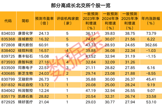 北交所个股当前机构关注度不高,仅有40只个股有机构评级。其中,康普化学、连城数控、曙光数创等13股机构一致预测今年、明年及2025年净利增速均超20%,其中康普化学、惠丰钻石和鼎智科技等3股未来3年净利增速均超30%。部分个股市场认可度较高,曙光数创、康普化学和锦好医疗等个股年内均大涨超50%。