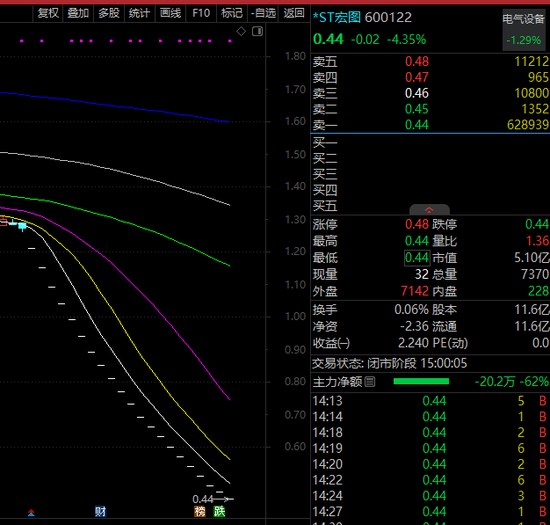 *ST宏图最新收盘价为0.44元,公司股票收盘价已连续17个交易日低于1元,早已提前锁定面值退市。此前,公司收到了证监会行政处罚事先告知书,造假金额巨大。根据事先告知书,*ST宏图连续多年虚构交易、虚增收入和利润,并虚减负债。*ST宏图上述行为导致其2017年至2021年财务报表虚减负债金额分别为90.63亿元、98.2亿元、98.01亿元、97.48亿元和97.48亿元,合计481.8亿元,其中2020年~2021年虚减负债金额合计194.96亿元,占这两年披露的期末净资产合计金额的4106.92%。
