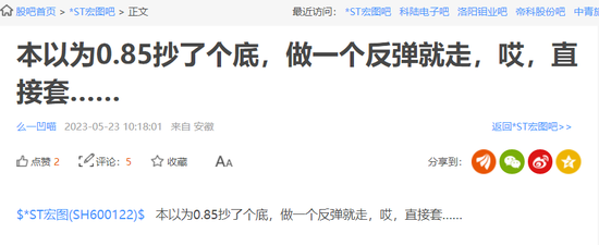 在贴吧中,还有一个投资者发帖称“本以为0.85抄了个底,做一个反弹就走,哎,直接套……”。回看*ST宏图的K线图可以发现,5月4日该股一字跌停时,成交量相对较大,或吸引了部分投资者抄底买入,当日收盘价也为0.85元,与上述投资者发帖买入价一致。然而,就在这一天之后,*ST宏图再度录得连续13个一字跌停板,投资者可谓抄底抄到半山腰。