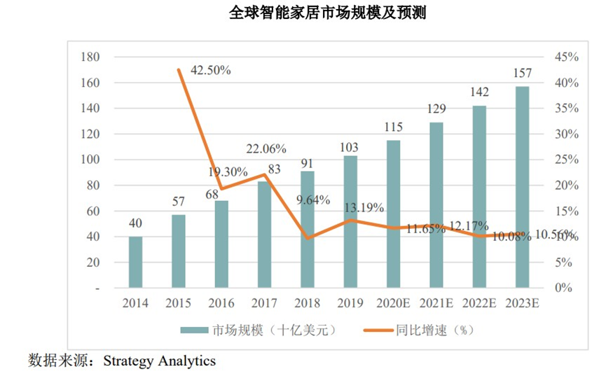 ?Strategy Analytics 发布《2019 年全球智能家居市场》的研究报告预测,2019 年全球消费者在智能家居方面的支出达到 1,030 亿美元,并预计将以 11%的年均复合增长率增长到 2023 年的 1,570 亿美元,呈快速发展态势。
