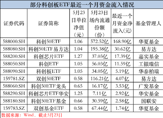 据Wind数据统计,截止5月23日,最近一个月时间,主要跟踪科创板及其关联指数的ETF产品合计“吸金”256.43亿元,其中,华夏科创50ETF“吸金”更是高达169亿元,位居全市场ETF资金净流入榜首,除此之外,易方达科创50ETF资金净流入也超过30亿元,嘉实科创芯片ETF、工银瑞信科创ETF两只基金资金净流入也均在10亿元之上。