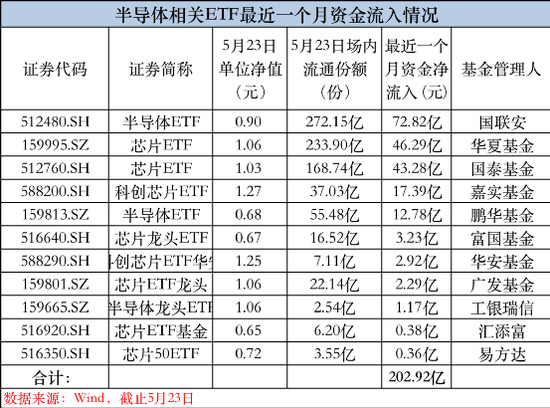 Wind数据统计显示,场内11只跟踪半导体或是芯片指数的ETF合计资金净流入超过202亿元。其中,国联安半导体ETF“吸金”72.82亿元,华夏芯片ETF、国泰芯片ETF资金净流入也分别达到46.29亿元、43.28亿元。上述3只半导体相关ETF更是“霸榜”最近一个月行业ETF资金净流入前三名。